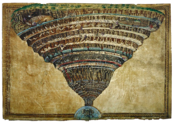 En la obra de Botticelli, Dante y Virgilio descienden por un enorme embudo excavado en la tierra hasta llegar a los círculos del Infierno.