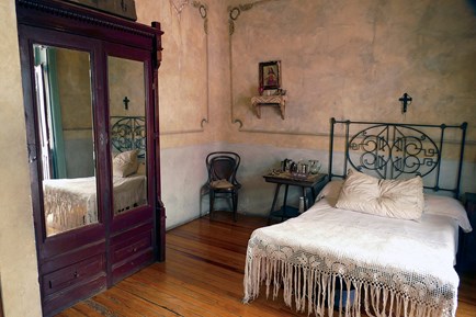 “Más allá, el viejo veliz de piel le recuerda al visitante que el poeta no alcanzó nunca a abordar el barco que debió llevarlo a Europa” (Hurtado). Dormitorio de Ramón López Velarde. Fotografía de Pascual Borzelli.