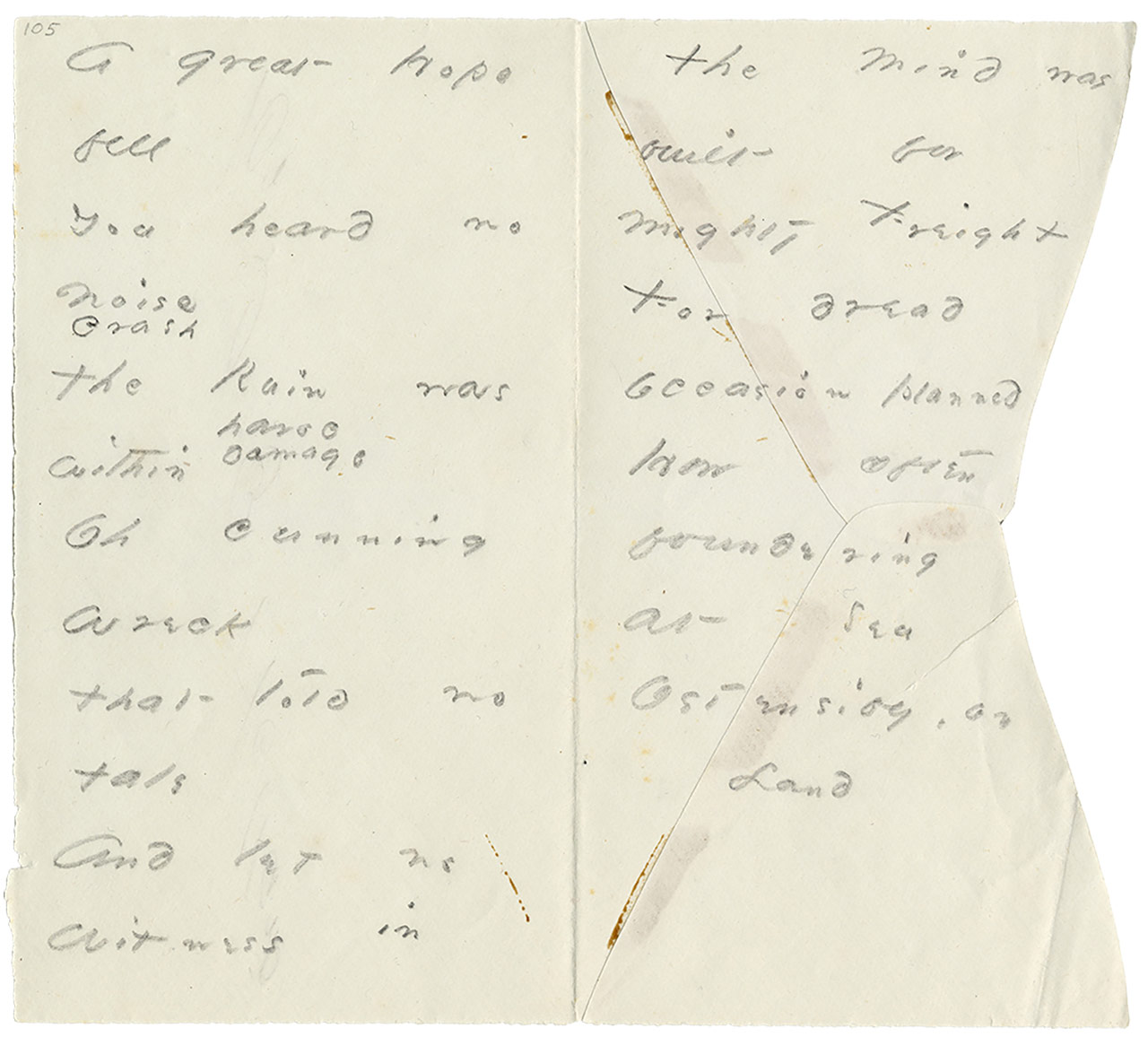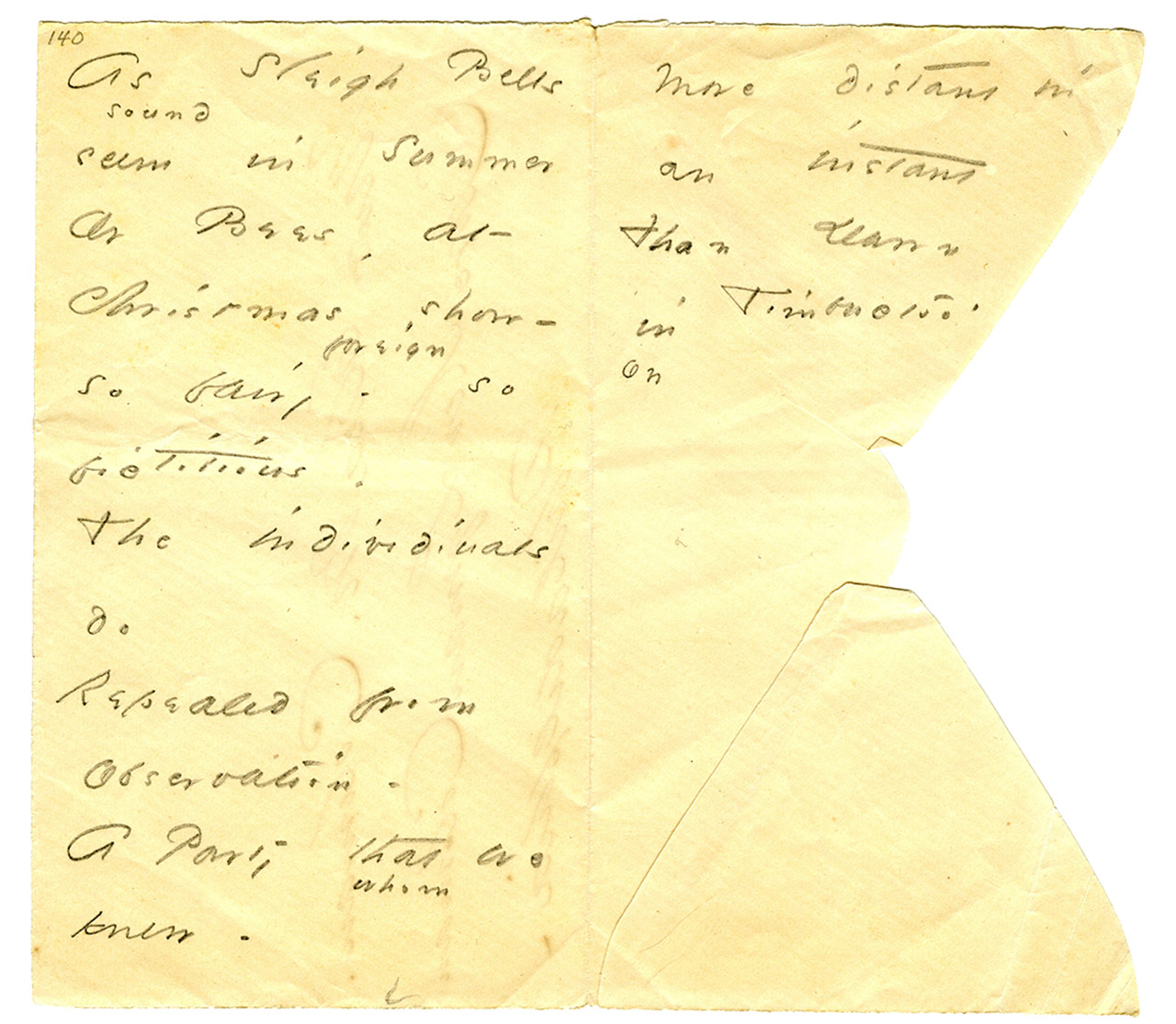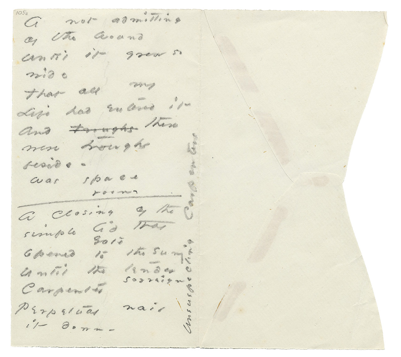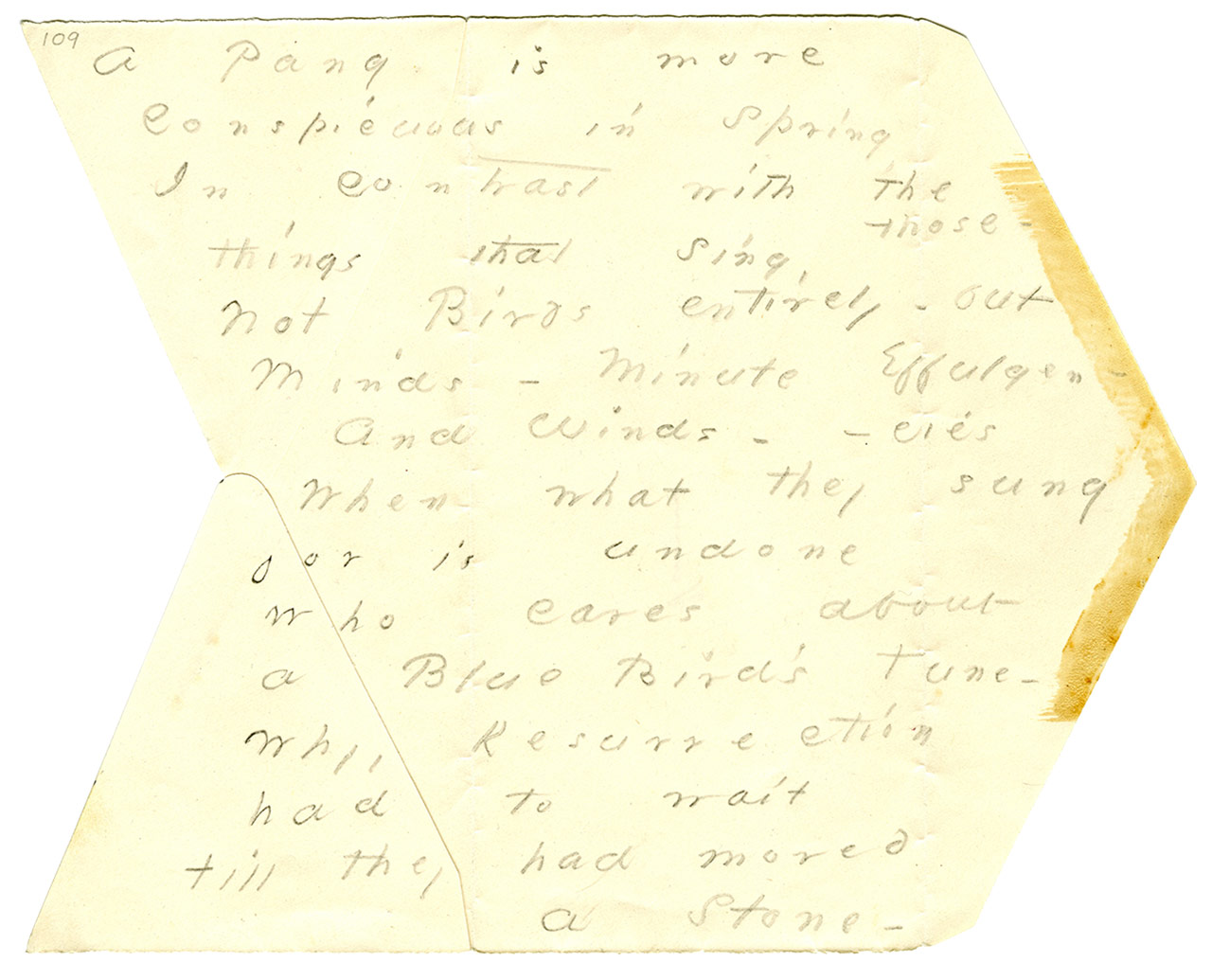 No cabe duda de que Dickinson sentía una especie de liberación al permitirse jugar con los formatos. Para muchos de nosotros, emborronar una idea al reverso de un papel usado le quita algo de presión o de formalidad a la escritura; de un modo arcano, como si fuera un talismán, ayuda a combatir el miedo frente a la página en blanco. Para Dickinson, no obstante, implicaba una emancipación todavía más trascendente. A fin de cuentas, contra la estabilización y la definitividad del texto había luchado ya toda su vida creativa: por un lado, con el rechazo de los títulos que osaran gobernarlo, con su gramática fracturada y polivalente, con su puntuación heterodoxa, y por el otro –ya también en materia gráfica–, con la abrumadora profusión de variantes textuales. Precedidas siempre por una cruz como llamada a pie o al margen, las variantes hacían que un mismo poema se volviera multidimensional, que se abriera repentinamente a la simultaneidad de alternativas y, por ende, a la posibilidad y concomitancia de diversas lecturas. Pero con la transgresión del formato, Dickinson buscó, además, otro tipo de efectos: efectos visuales, lúdicos quizá, que al mismo tiempo le permitieran dialogar con el espacio de modos imprevistos, ensayar sus capacidades expresivas, tal vez hasta replantearse todo aquello que suponen los mecanismos de significación. No en vano escribió en el otoño de 1862: