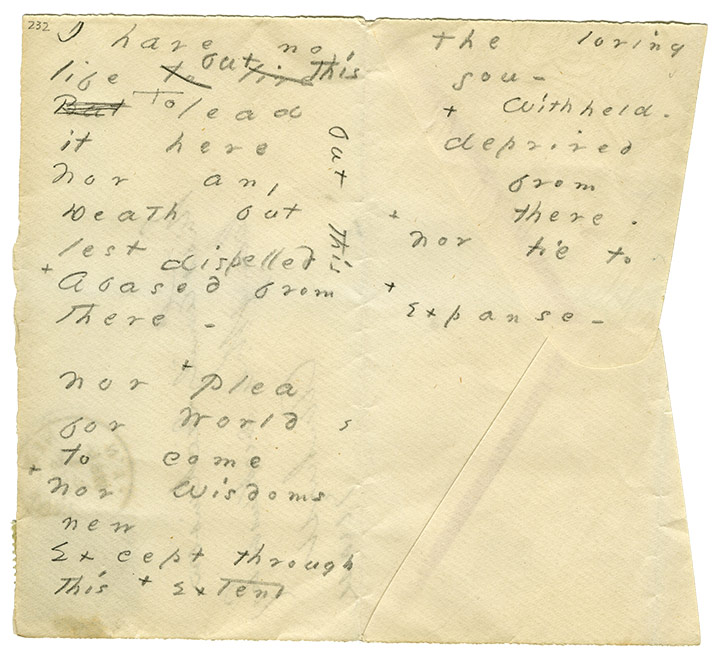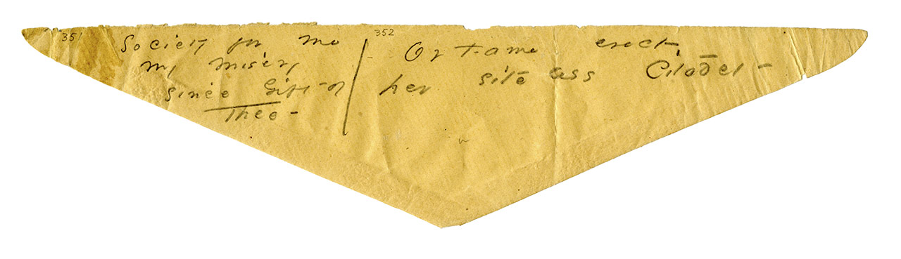 Y sí, característicamente, el primer verso de este poema ofrece una variante. En el manuscrito, una discreta cruz colocada antes del trazo largo de “palabras” abre una disyuntiva que conduce a una lectura alterna: “Hallé la frase para cada idea”. Faltaba aún por ver si Dickinson encontraba también la forma.