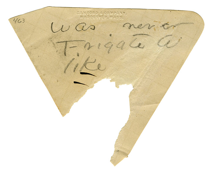 La fecha en la que Dickinson empezó a escribir en papeles sueltos coincide más o menos con aquella en la que dejó de producir los fascículos en papel estándar. Es claro, en mi opinión, que la poeta se interesó cada vez más en asuntos de formato, en la posible interacción entre las palabras y su soporte material y, a la vez, en la relación que existe entre las palabras y el universo que representan. Es notable por esto último –por citar sólo un caso entre muchos– una carta que le envió a Thomas Niles, editor de Roberts Brothers, en 1883. En ella incluyó una nota (“Te mando un gélido Regalo –mi Grillo– y la Nieve”) y dos poemas, uno sobre una congregación de grillos (J1086 / Fr895) y otro sobre un paisaje nevado (J311 / Fr291), a lo cual adjuntó, además, en su pulcro envoltorio de papel, el cadáver del mentado insecto. Me imagino el sobresalto del destinatario, pero aún más claramente me imagino a la poeta en su jardín a la caza de ese grillo, y creo que esa imagen ayuda a entender la complejidad del vínculo que ella veía entre el mundo físico y su representación mental. El impulso es el mismo que la llevaba a recolectar flores para secarlas y añadirlas a su herbario, o bien para enviarlas a sus corresponsales (antologías, en su sentido etimológico), pegadas o prendidas de un alfiler a la hoja en la que había escrito su mensaje.
